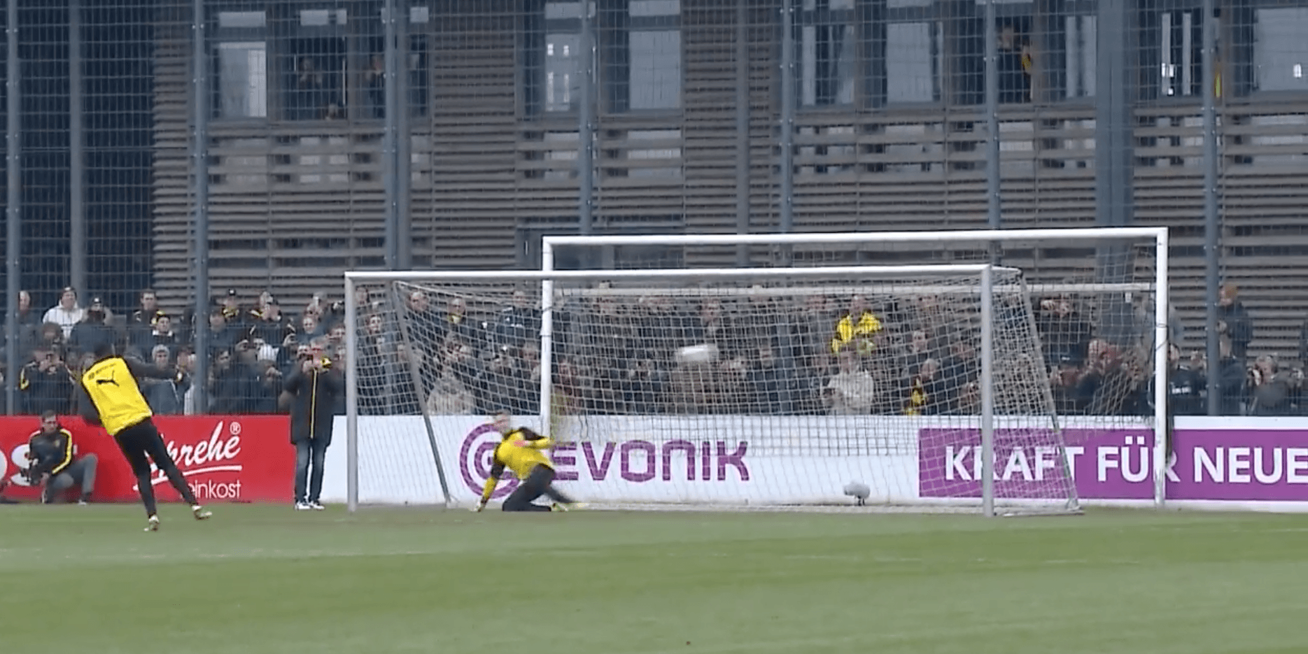 Elfmeter versenkt: Usain Bolt am Punkt. (Screenshot: YouTube-Kanal des BVB)