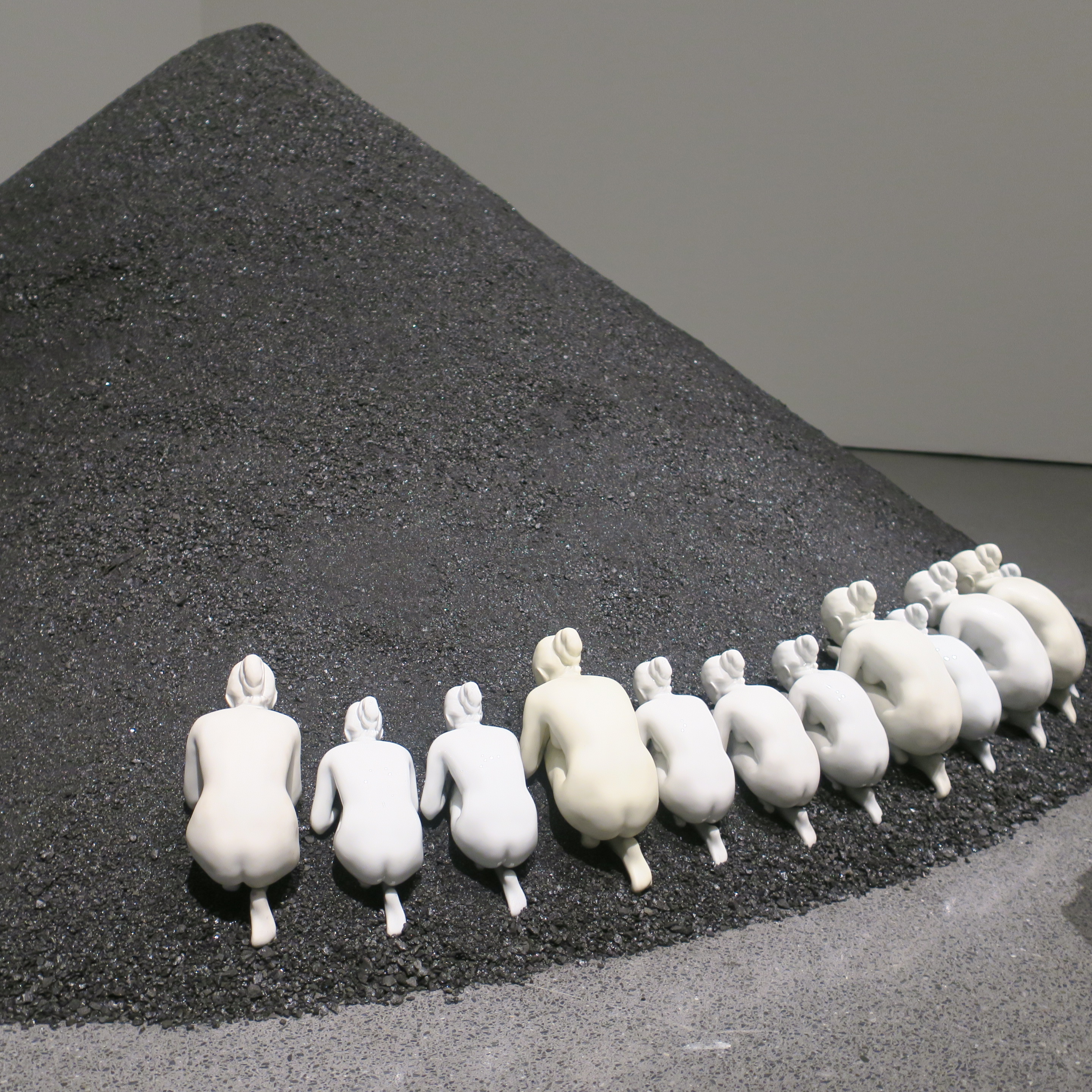Weiße Nymphen am Fuße einer Kohlehalde: Blick auf Alicja Kwades Installation „Die Trinkenden“ im Museum Ostwall im Dortmunder „U“. (Foto: Bernd Berke)