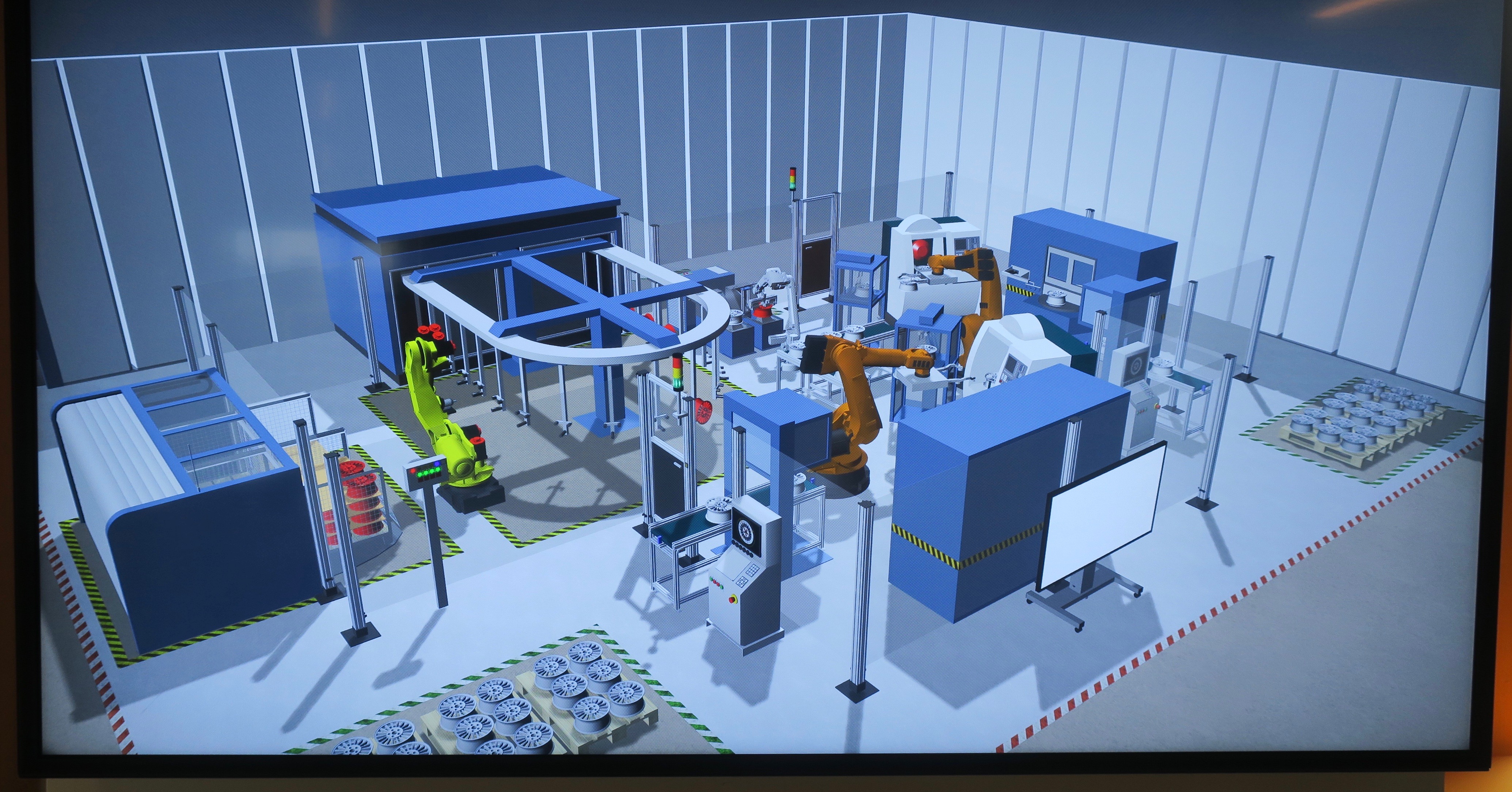 Visionärer Bildschirm-Blick in eine Fabrik, in der Roboter der neuesten Generation zu Werke gehen. (DASA / Foto: Bernd Berke)