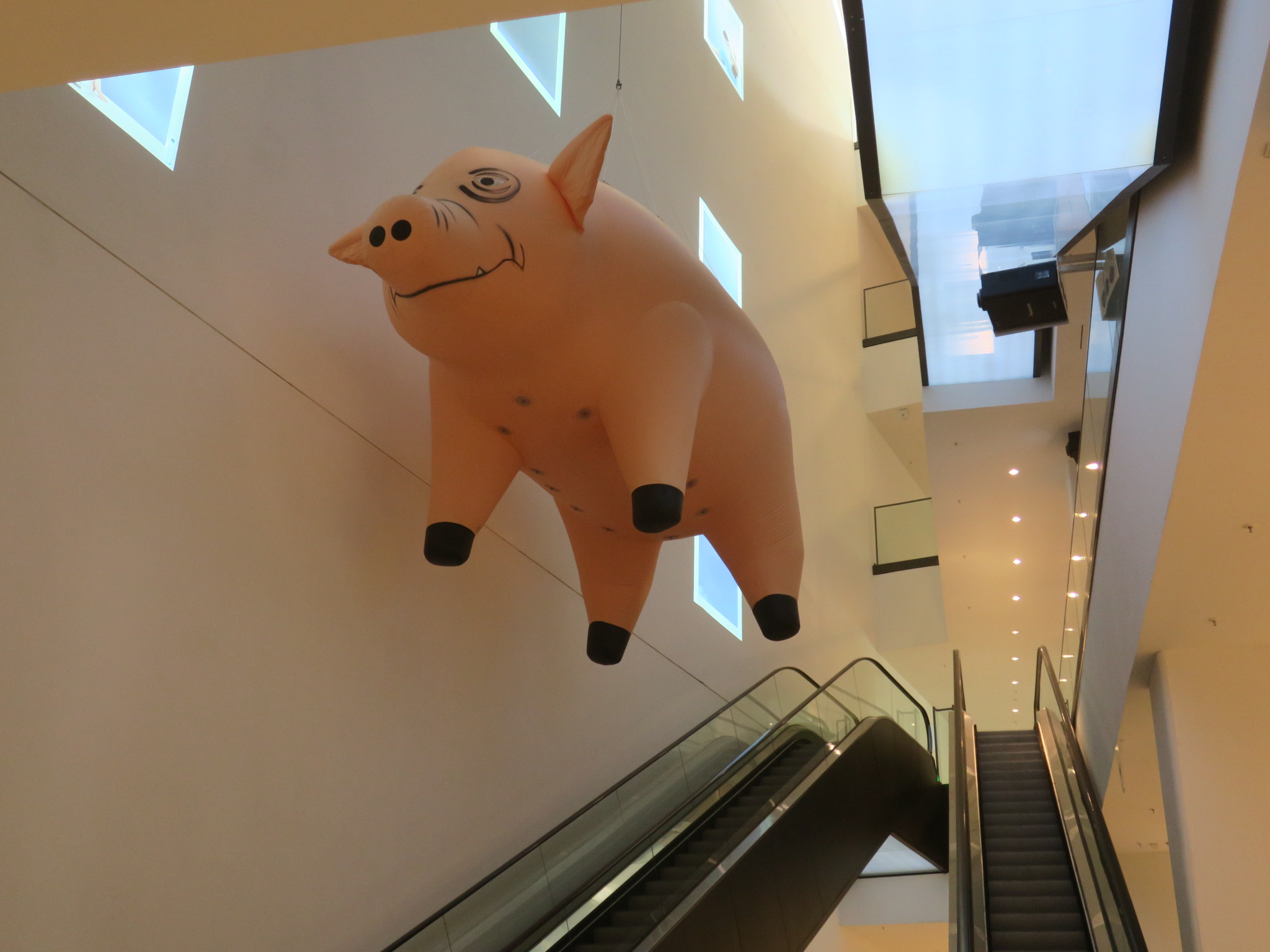 Ein Markenzeichen der Band: schwebendes Schwein im Rolltreppenhaus des „Dortmunder U“. (Foto: Bernd Berke)