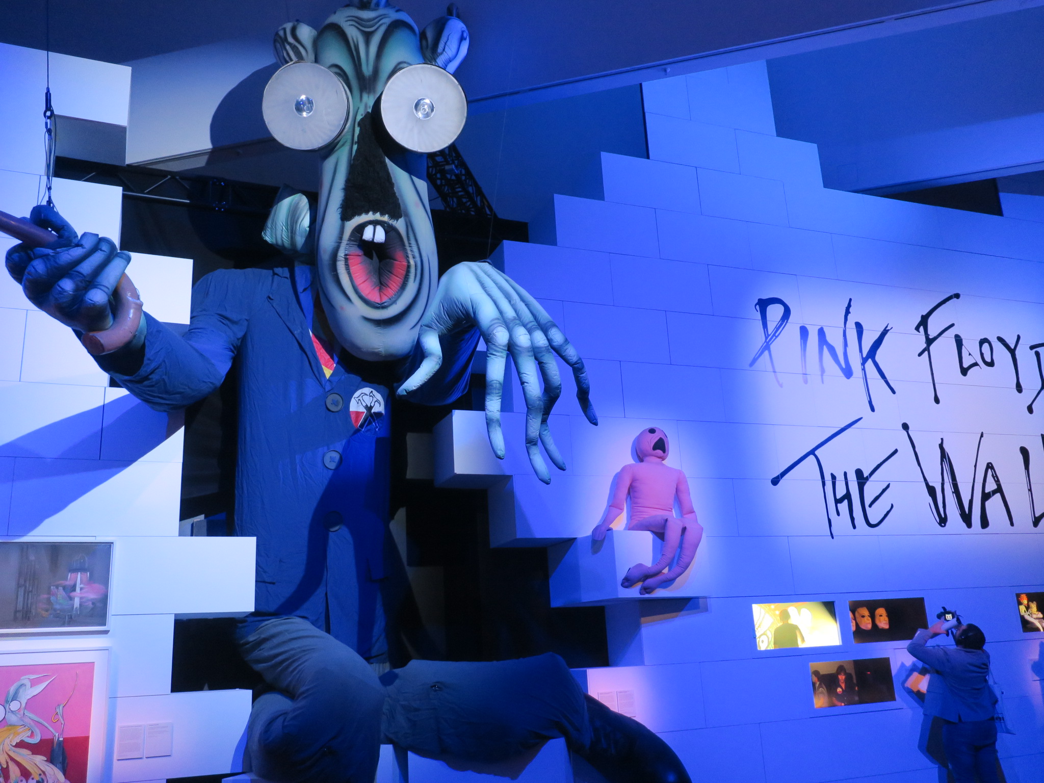 Blick in die Dortmunder „Pink Floyd“-Ausstellung: Der schreckliche Lehrer bricht durch die Mauer, die dem ungleich größeren Exemplar aus der Konzertreihe „The Wall“ nachempfunden ist. (Foto: Bernd Berke)