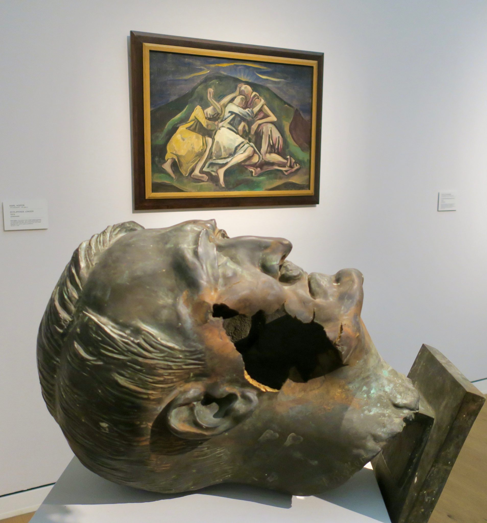 Von einer Kriegsgranate durchlöchert und bewusst achtlos hingelegt: Hitler-Kopf des NS-Bildhauers Arno Breker. Im Hintergrund ein Gemälde von Karl Hofer. (Foto: Bernd Berke)