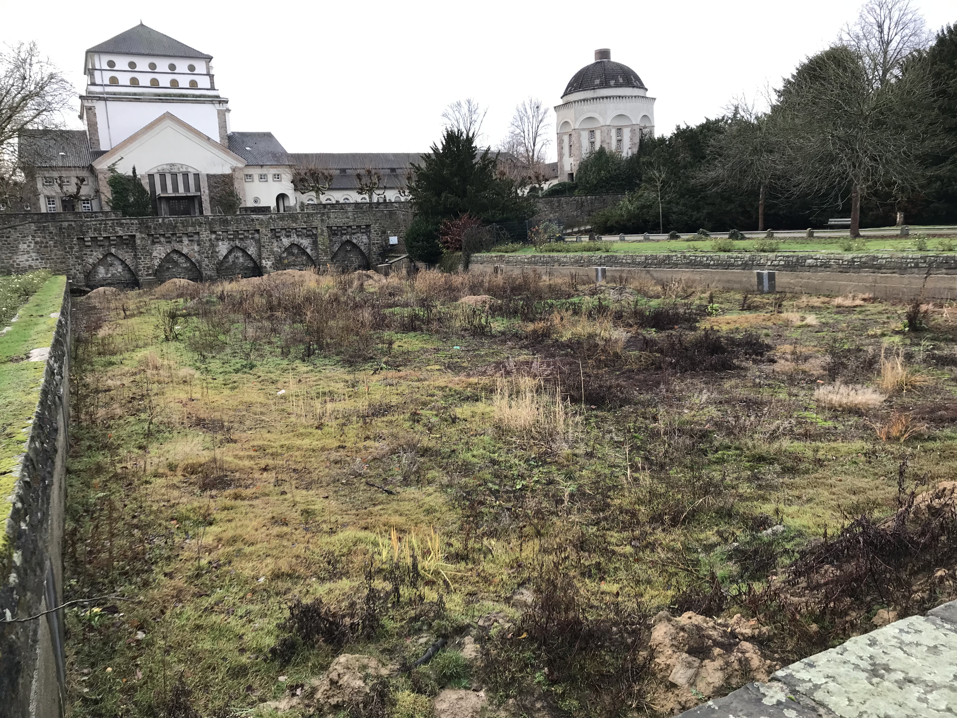 Einst war’s ein Teich, heute ist es eine Art Steppe im Becken. (Foto im Dezember 2018: Bernd Berke)