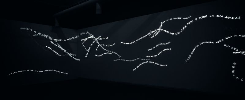 Wie Schlangen gleiten in der Biennale-Installation von 2003 die Fragen von Fischli & Weiss über eine schwarze Wand. c Fischli&Weiss