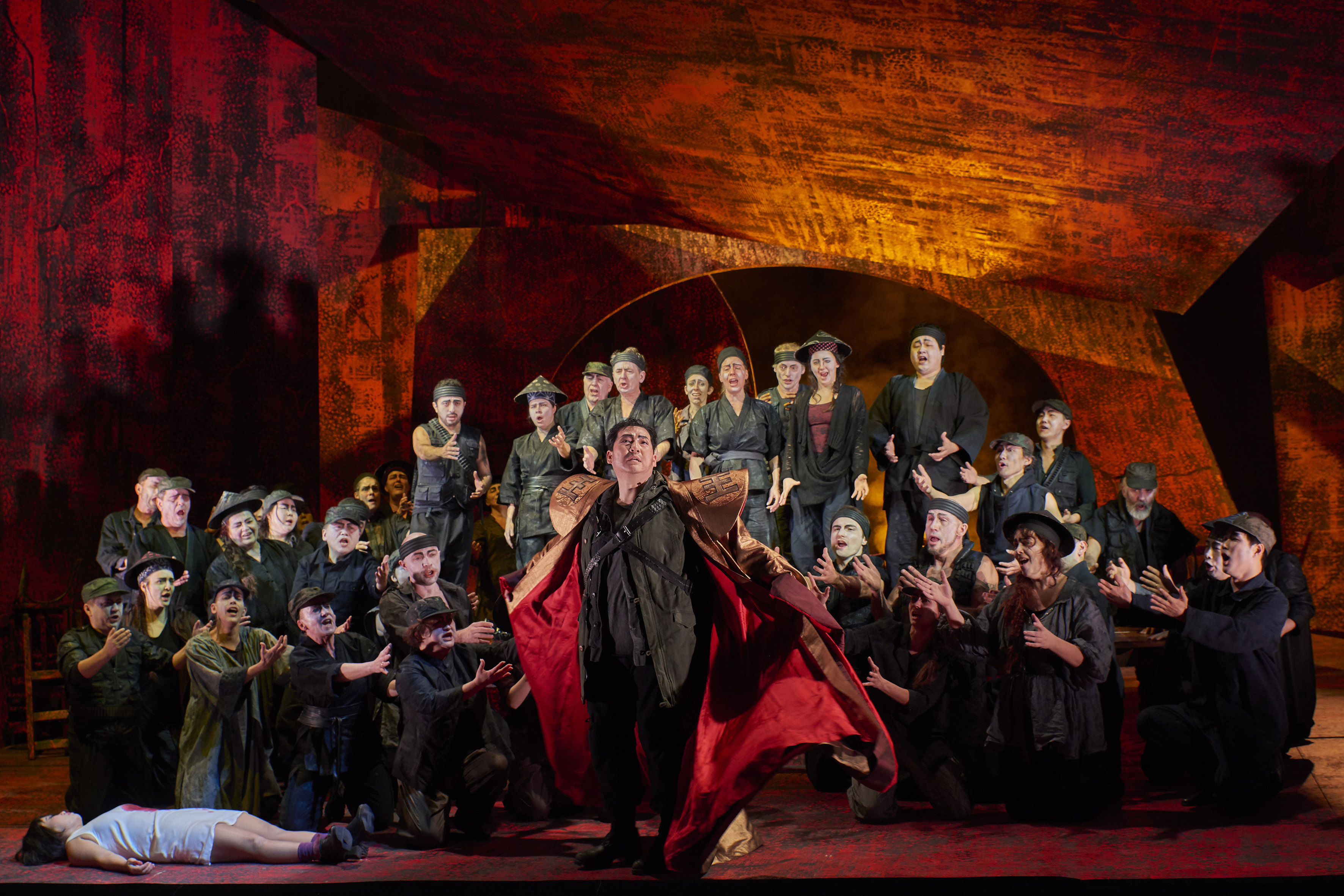 In der Siegerpose: Calaf (Andrea Shin) hängt sich den Mantel des alten Kaisers um (Foto: Björn Hickmann)