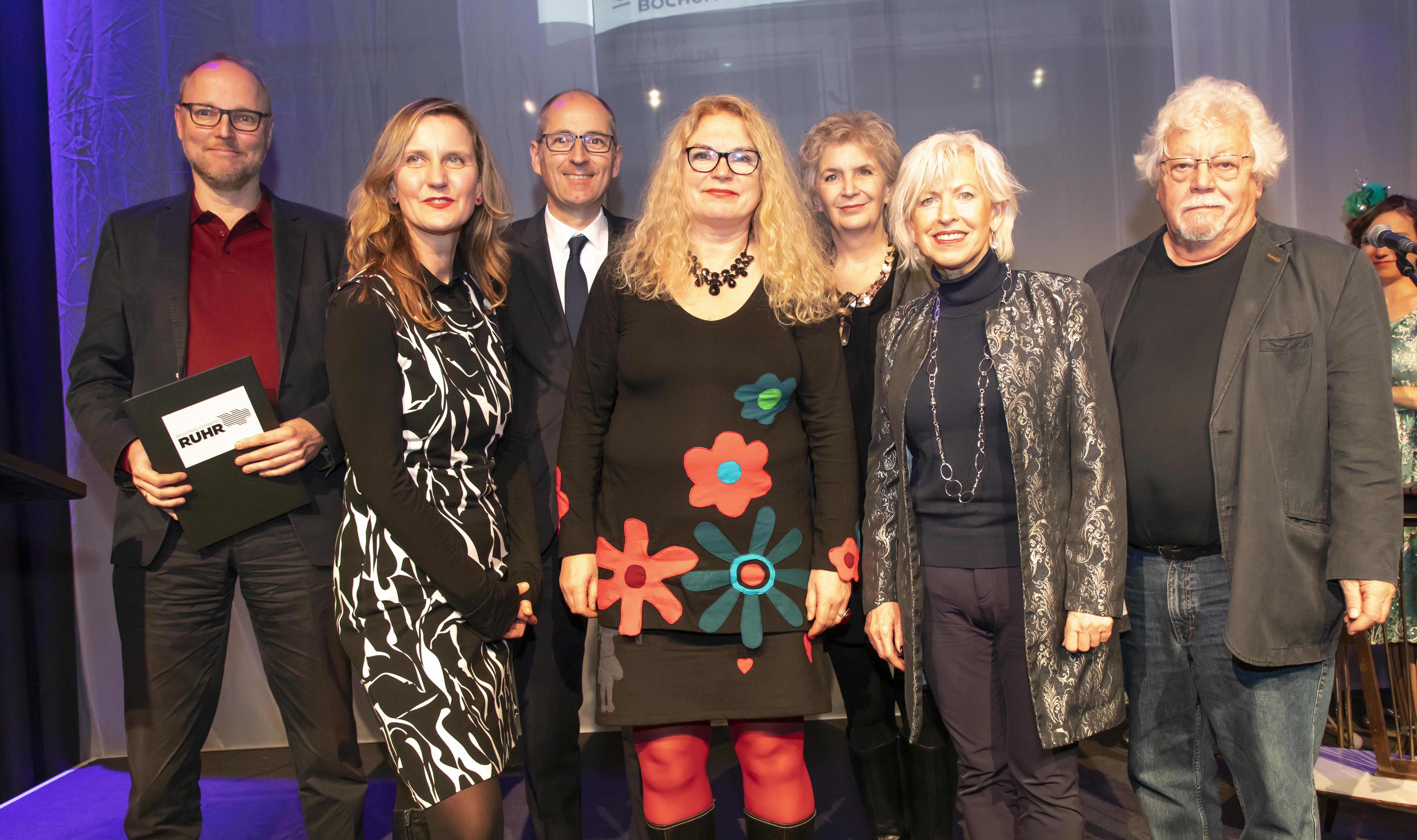 Gruppenbild von der (vorerst) letzten Preisverleihung mit (v. li.): Oliver Driesen (Förderpreisträger), Ingrid Kaltenegger (Förderpreisträgerin), Dietmar Dieckmann (Kulturdezernent Bochum), Elke Heinemann (Hauptpreiströgerin), Ulli Langenbrinck (Laudatorin), Monika Simshäuser (Vorsitzende im RVR-Kulturausschuss), Hanns Krauss. (Foto: RVR/Tack)
