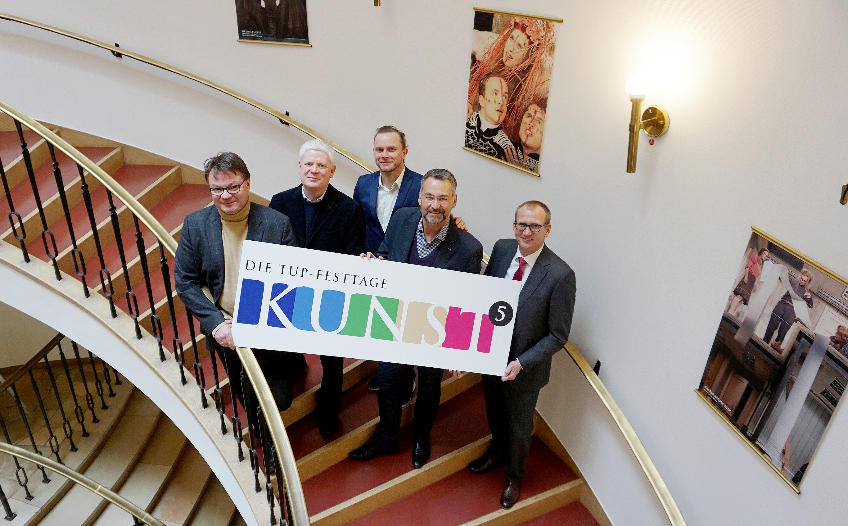 Freuen sich auf die TUP-Festtage 2019: Schauspielintendant Christian Tombeil, TUP-Geschäftsführer Berger Bergmann, der stellvertretende Ballettintendant und Ballettmanager Marek Tuma, Musiktheater- und Philharmonieintendant Hein Mulders sowie Oliver Bohnenkamp, Vorstandsmitglied der Sparkasse Essen. Foto: TuP