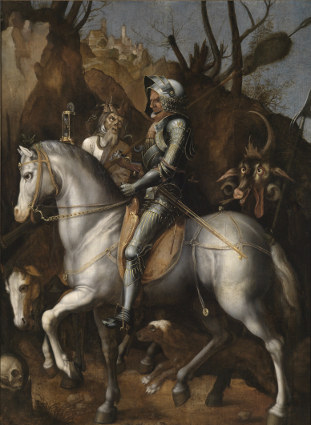 Johann Geminger: Ritter, Tod und Teufel (nach Dürer, um 1600), Öl/Holz, 141 x 104,5 cm, Staatliche Kunsthalle Karlsruhe Inv. Nr. 913, (c) Kunsthalle Karlsruhe