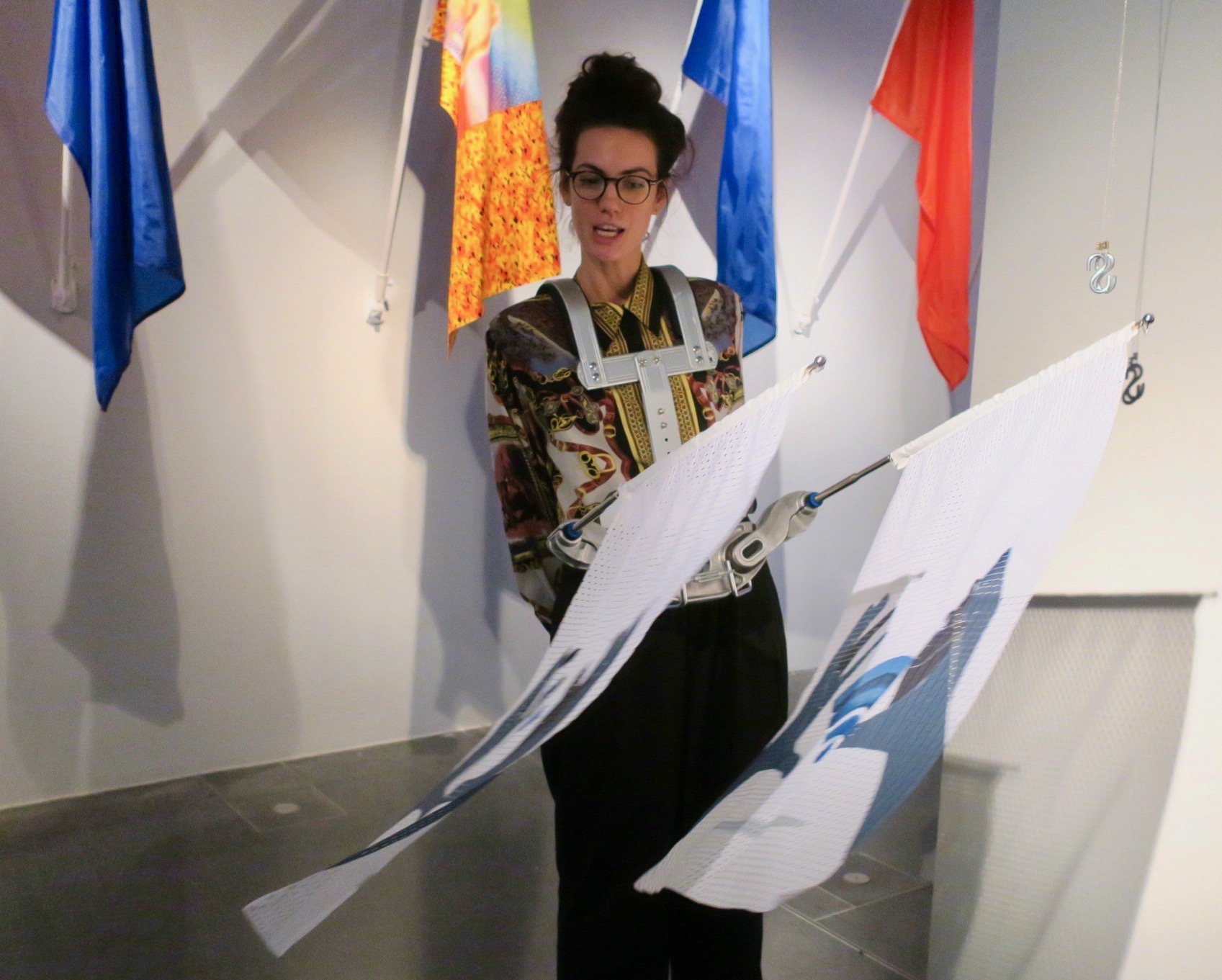Auf den Spuren eines sonderbaren Flaggenkults: Die serbische Künstlerin Vanja Smiljanic hat sich zu Demonstrations-Zwecken eine Fahnenschwenk-Apparatur umgeschnallt. (Foto: Bernd Berke)