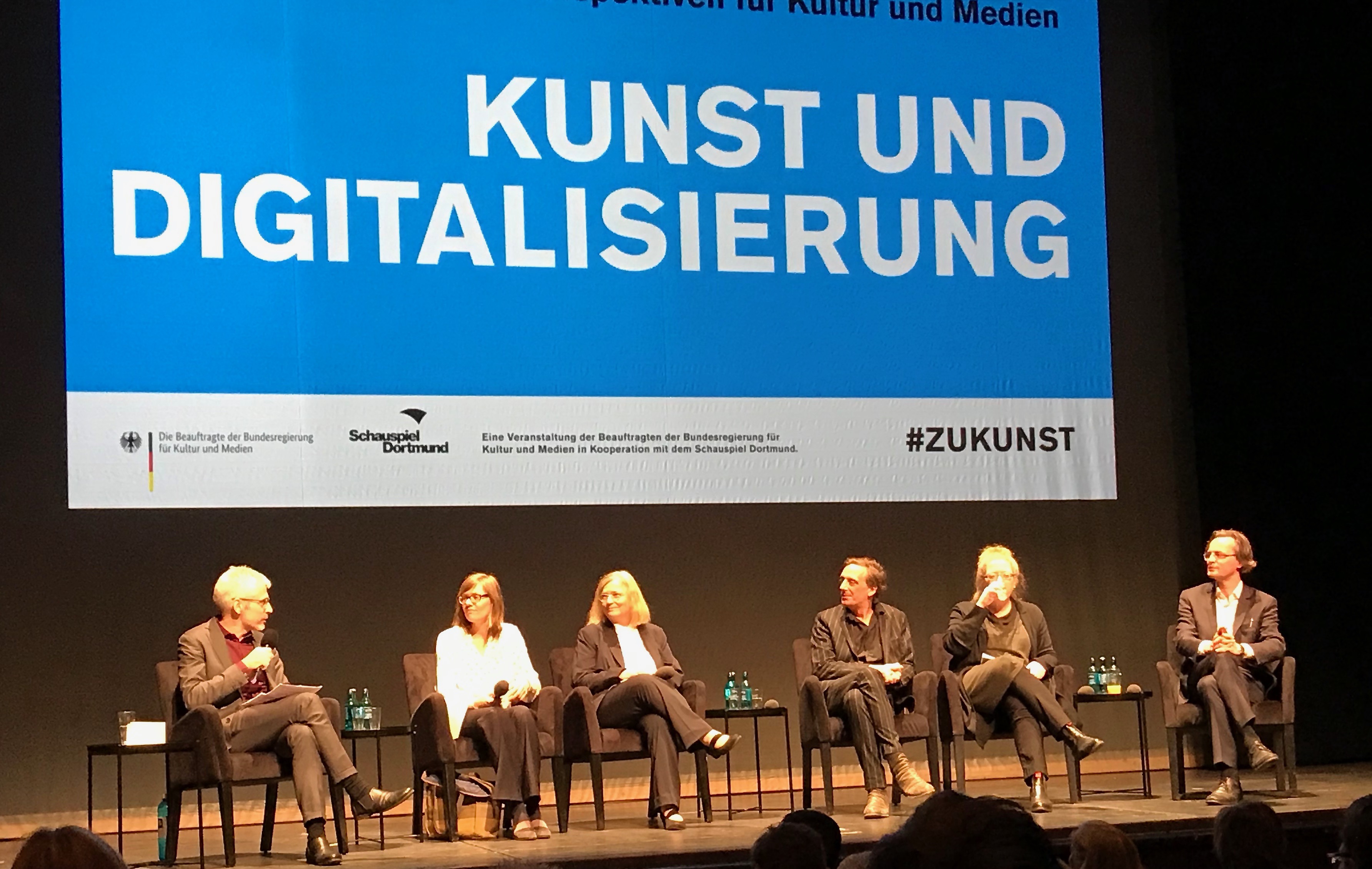 Auf dem Dortmunder Diskussions-Podium (von links): Moderator Tobi Müller, Verlegerin Nikola Richter, Museums-Expertin Prof. Monika Hagedorn-Saupe, Dortmunds Schauspielchef Kay Voges, Inke Arns (Leiterin des Hartware MedienKunstVereins – HMKV) und der Medienwissenschaftler Prof. Bernhard Pörksen. (Foto: Bernd Berke)