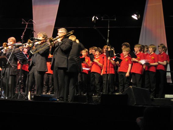 Knabenchor der Chorakademie Dortmund auf dem Moers Festival 2012 neben Musikern der Bohuslän Big Band aus Schweden; Foto: W.Cz.