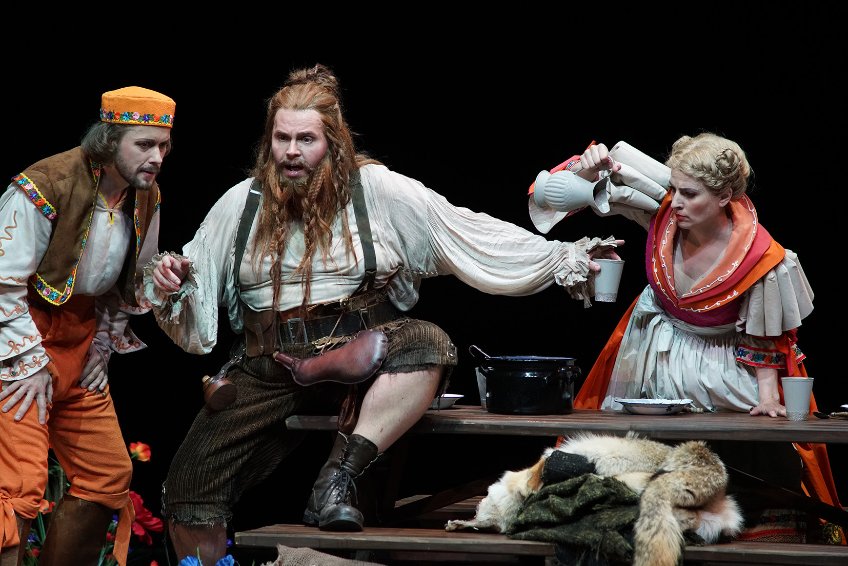 Der Räuber Babinsky (Uwe Stickert, Mitte) drängt sich zwischen Schwanda (Piotr Prochera, l.) und dessen junge Frau Dorota (Ilia Papandreou. Foto: Monika Forster)