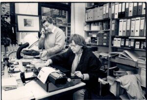In den besseren Zeiten beim Oberhausener assoverlag: Verlagsgründerinnen Annemarie Stern (am Telefon) und Anneliese Althoff (an der Schreibmaschine).