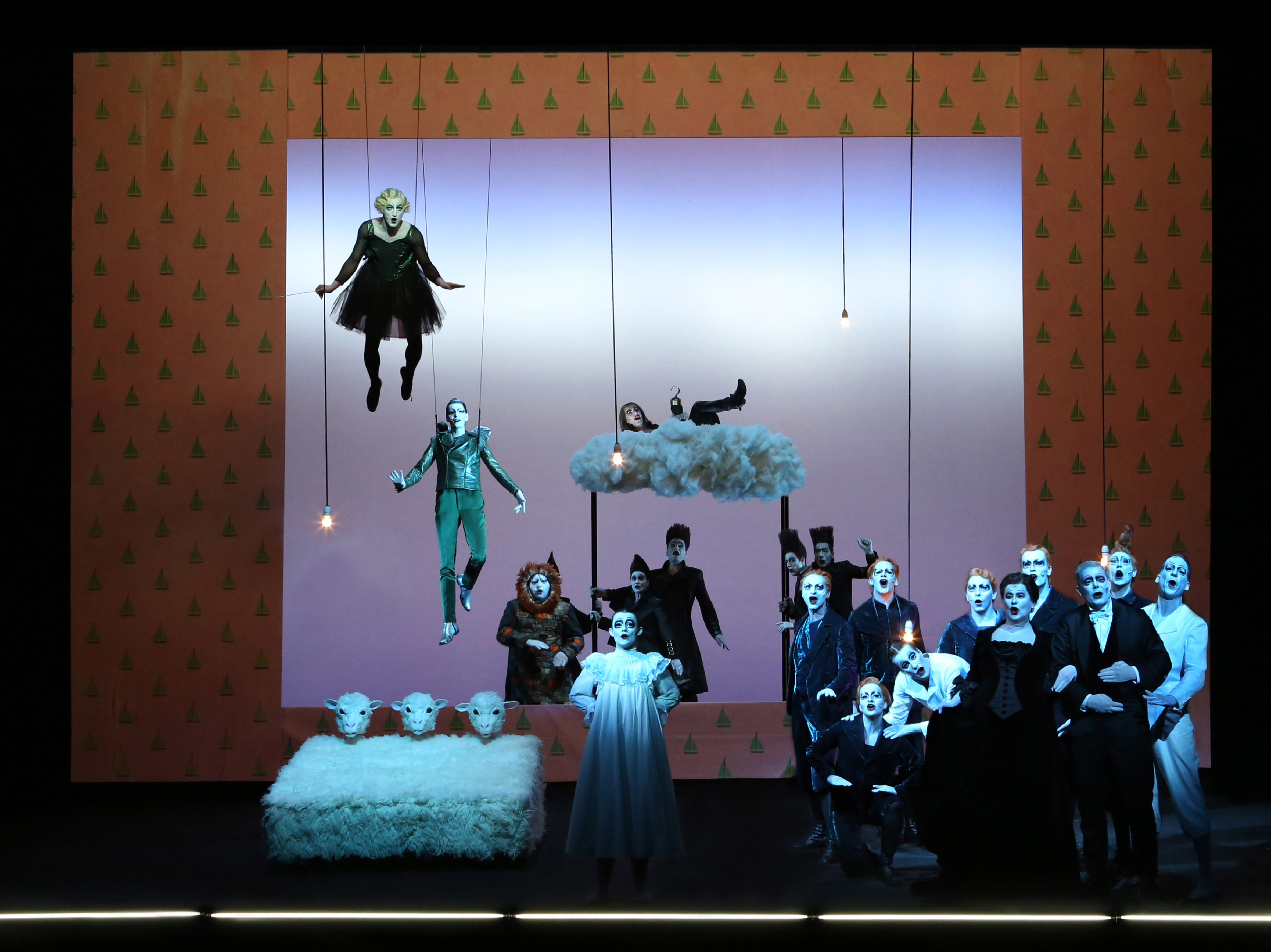 Szene aus „Peter Pan“ mit (in der Luft schwebend) Christopher Nell, Sabin Tambrea, Stefan Kurt) und Ensemble. (Foto: © Lucie Jansch/Berliner Ensemble)